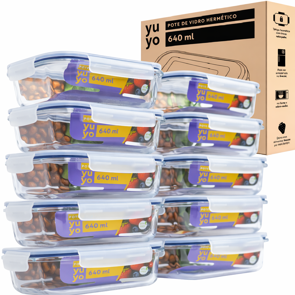 O kit com 10 potes herméticos de vidro de 640 ml é uma opção equilibrada de custo-benefício para quem busca organizar e conservar alimentos no dia a dia. Com capacidade ideal para marmitas, porções individuais e sobras, o conjunto é feito em vidro, material que não retém odores nem manchas, trazendo mais higiene e praticidade para a rotina na cozinha.